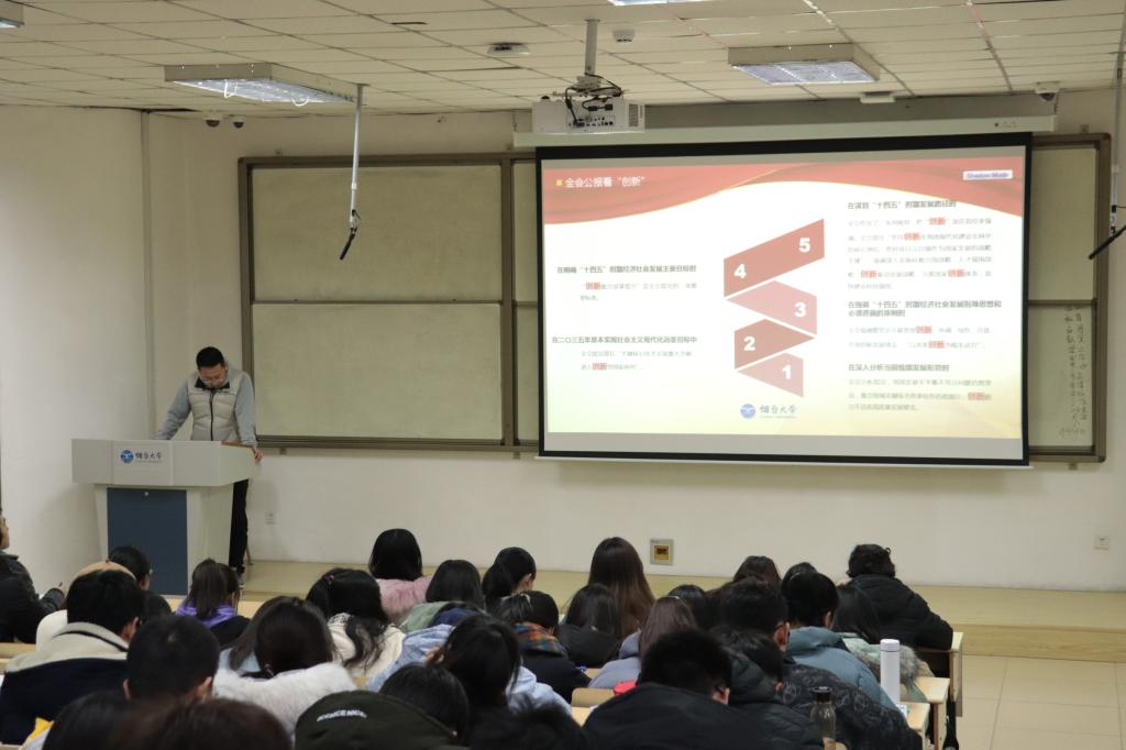在近一小时的课堂上,张仁旭分别从“坚持创新核心地位,总书记有何考量”、“处处有‘人’,总书记谋划‘十四五’的鲜明导向”、“加快构建新发展格局,总书记心中有盘‘棋’”三部分向同学们讲授。引导同学们牢固树立创新意识,不忘为人民谋幸福初心,坚持新发展格局,发挥青春力量。