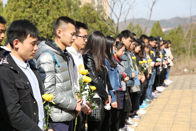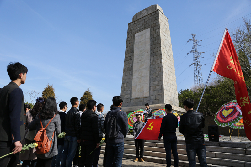 缅怀仪式分为三个环节,首先高峰同学代表全体研究生进行了发言,既表达了对先烈们的无比崇敬和沉痛追思,又表达了研究生立志科研的决心;员工团委副书记杜永铎带领所有党员以青春的名义,在党旗下庄严宣誓,展现了当代青年的精神面貌,慷慨的誓言响彻凤凰山;最后,所有的党员默哀一分钟,并在烈士墓前献上菊花,寄托我们崇高的敬意和深深的哀思。