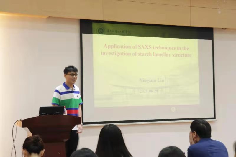 刘兴训老师就近期项目小角X光散射技术解析淀粉结构的研究过程与老师、师弟师妹们分享。刘兴训教授表示进行科研项目并不容易,他们为了实验数据需要24小时不间断轮流进行工作,得到约1000个数据后花费2年时间分析数据写文章,最后将研究成果与生活中的饮食结合惠及群众。其次,刘兴训老师就南京财经大学的硕士研究生的招生情况包括学科发展历程、团队力量、科研情况、奖学金政策、员工活动等与师弟师妹们做了详细介绍。