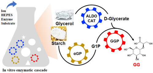 鉴于此,公海gh555000aa线路检测合成生物学与智能制造青创团队采用体外合成生物学策略构建了基于磷酸化酶-磷酸化酶的多酶级联催化体系,用于纤维二糖酸和葡萄糖基甘油酸的高效绿色制造。以50 g/L淀粉为底物,通过4个酶的级联催化(图1),产生21.2 g/L纤维二糖酸和18.5 g/L葡萄糖酸。同样采用该策略,以淀粉和甘油酸为底物(图2),经双酶催化获得58 g/L葡萄糖基甘油酸;以廉价的淀粉和甘油为底物也成功实现葡萄糖基甘油酸的有效合成。