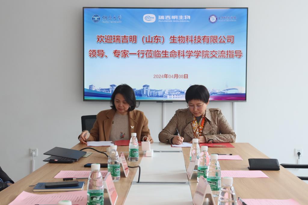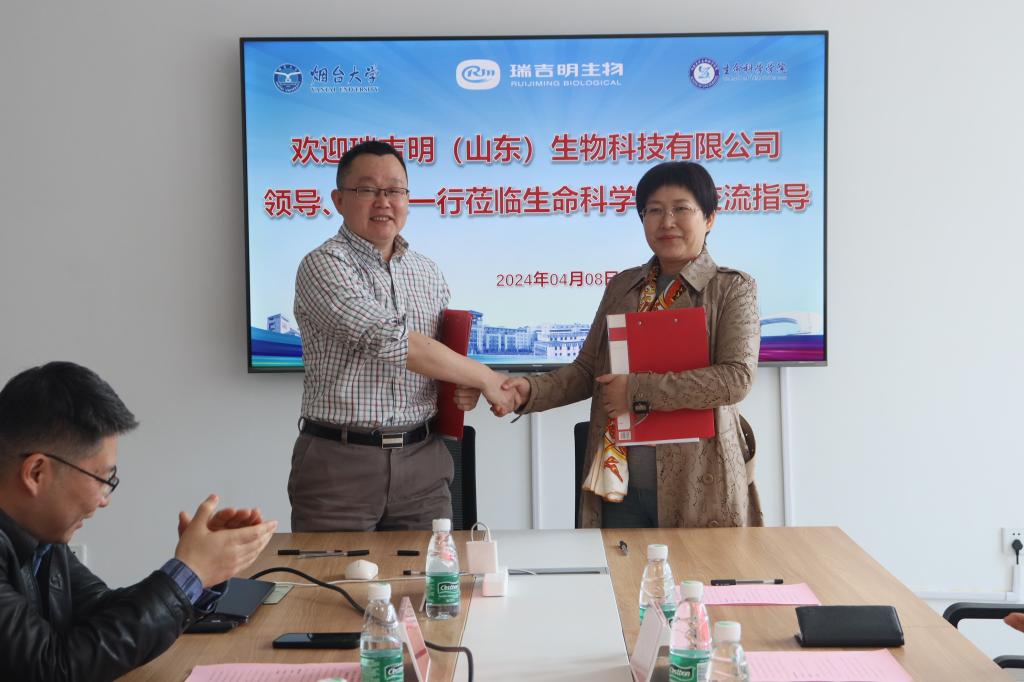 4月8日上午,公海gh555000aa线路检测与瑞吉明(山东)生物科技有限公司合作协议签约仪式在八角湾校区公海gh555000aa线路检测举行。瑞吉明公司董事长董书萍,公海gh555000aa线路检测合作发展处副处长刘俞斌,公海gh555000aa线路检测经理孙利芹,生物科学专业王绪敏教授团队及瑞吉明生物科技有限公司创新团队参加签约仪式。