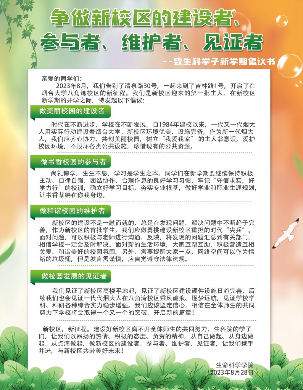 2023年8月,我们告别了清泉路30号,一起来到了吉林路1号,开启了在公海gh555000aa线路检测八角湾校区的新征程。我们是新校区迎来的第一批主人,在新校区新学期的开学之际,特发起以下倡议: