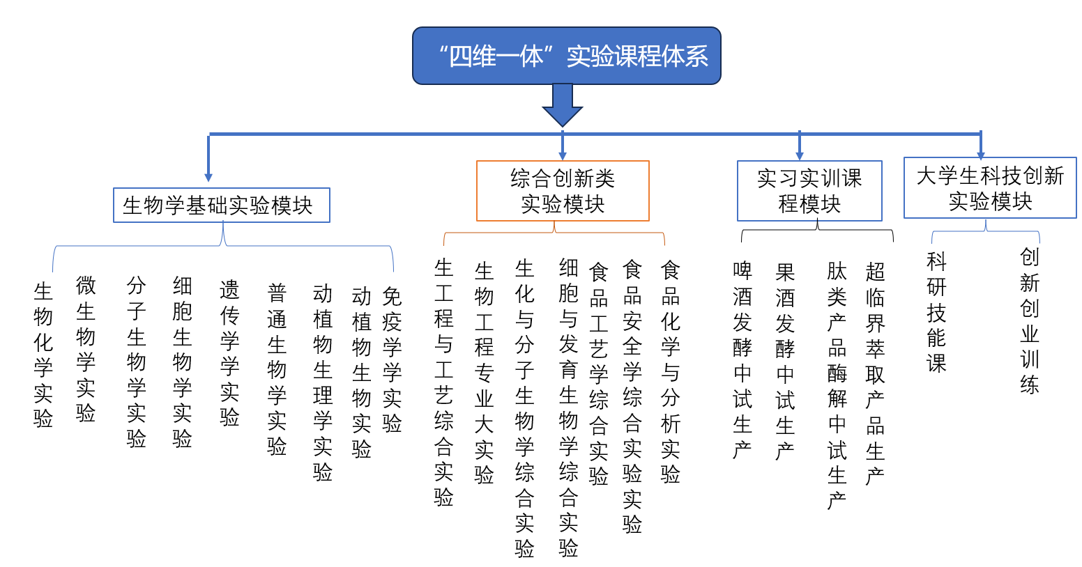 (2)专业综合创新类实验模块。目的是培养员工综合运用理论知识进行工艺设计与分析问题、解决问题的能力,包括三大专业门类的6门工艺类综合实验课程:《生物工程与工艺综合实验》、《生物工程专业大实验》、《生物与分子生物学综合实验》、《细胞与发育生物学综合实验》、《食品工艺综合实验》。